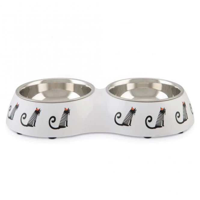 nicht verrutschen kann. Die eingefügten Edelstahlnäpfe sind herausnehmbar. Zur Reinigung sollte