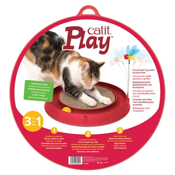 Das unwiderstehliche Katzenspielzeug mit Kratzfläche, Spielschiene und Ball sowie einem federnden Bienen-Spielzeug.