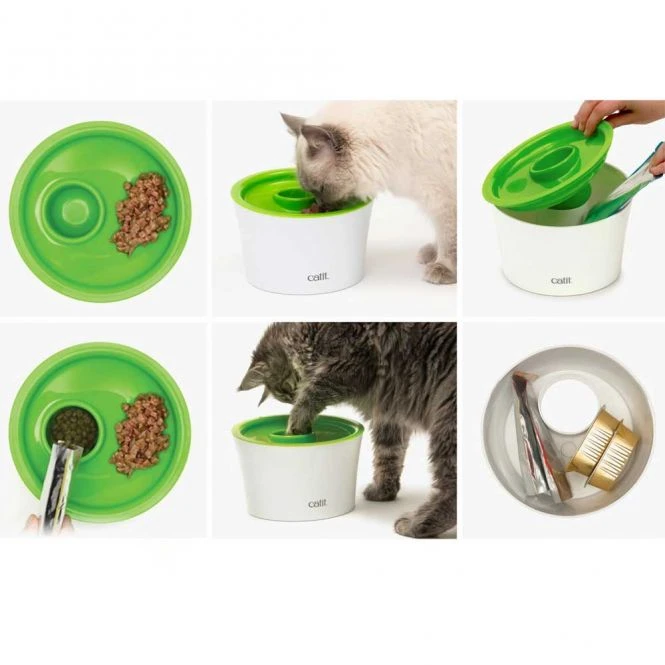 Der Catit 3-in-1-Napf eignet sich hervorragend, um Ihrer Katze nasses und trockenes Futter zu servieren.