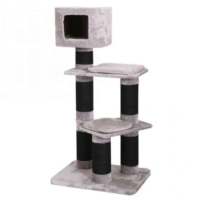 Am Baum kann gekratzt werden, und auf den verschiedenen weichen Plüsch-Liegeflächen oder im Katzenhäuschen schläft es sich herrlich.