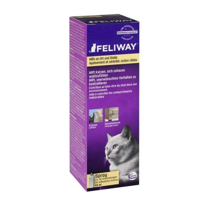 Das FELIWAY Spray ermöglicht die zielgenaue und komfortable Anwendung auf allen Stellen im Haus, die von Kratzen oder Harnmarkieren betroffen sind. FELIWAY ist dem natürlichen Wohlfühlpheromon der Katze nachempfunden. Das Spray hilft perfekt, dem Harn- und Kratzmarkieren der Katze punktuell vorzubeugen. Sind bestimmte Stresssituationen im Haus (z.B. Konflikte im Mehrkatzenhaushalt) Ursache für das Kratzen oder Harnmarkieren, wird der Einsatz des Sprays ideal durch den FELIWAY Happy Home Verdampfer unterstützt.