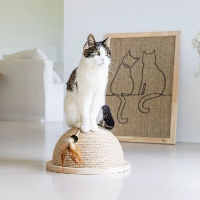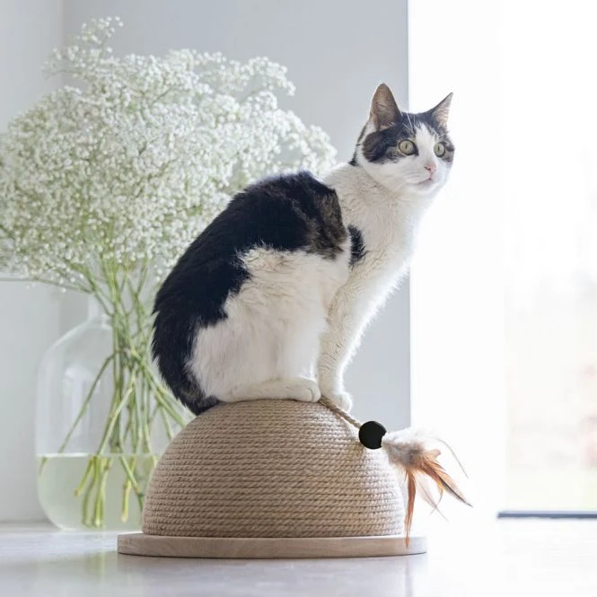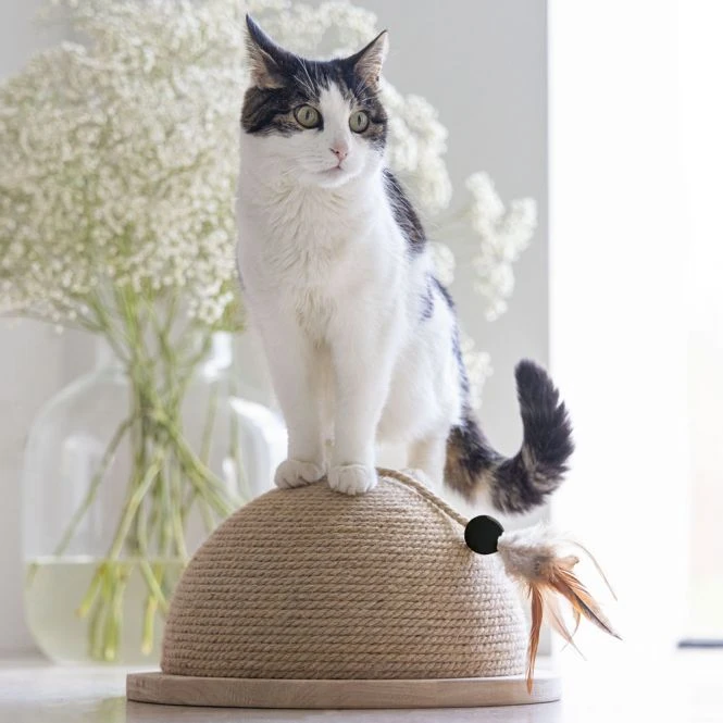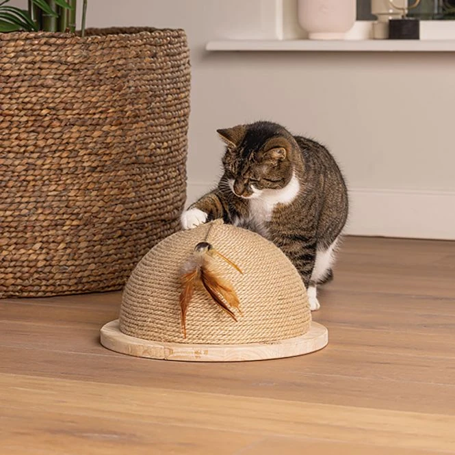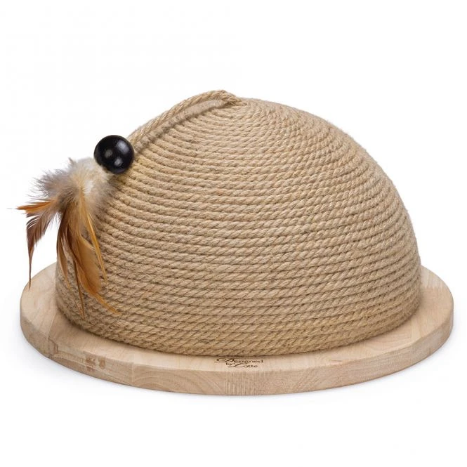 Möchten Sie Ihrer Katze einen einzigartigen, schönen und auch individuellen Kratzbaum bieten? Dann ist der Kratzball Halbkugel Vivi von Designed by Lotte auf jeden Fall zu empfehlen. Wie der Name schon sagt, besteht dieser Kratzbaum aus einer Halbkugel, an der Ihre Katze nach Herzenslust kratzen kann. Das um die Kugel gewickelte Kratzteil besteht aus Juteseil. Neben dem Kratzen eignet sich dieser Kratzball auch hervorragend zum Spielen. Denn an dem Ball ist oberhalb ein Katzenspielzeug mit Federn befestigt. Sie können wählen, ob Ihre Katze diesen Ball horizontal oder vertikal kratzen soll. Sie können den Kratzball auf den Boden stellen oder ihn an der Wand aufhängen. Das Aufhängesystem und die Anleitung werden mit dem Ball geliefert.