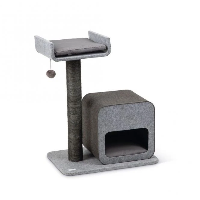 Dank der Materialwahl und der puristischen Farbgebung in Grautönen ist der Kratzbaum ein zeitlos schönes Möbel, das sich vielen Einrichtungsstilen anpasst. Vom Liegeplatz aus kann die Katze alles im Auge behalten, dort lässt sich aber auch gut ein kleines Nickerchen halten. Und natürlich lädt besonders das Katzenhaus nach einer ausgiebigen Kratzsession zum entspannten Verweilen ein.