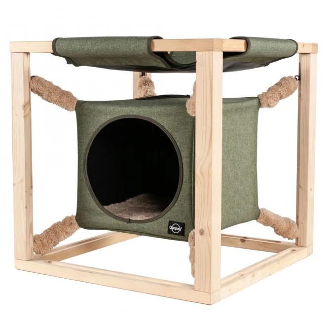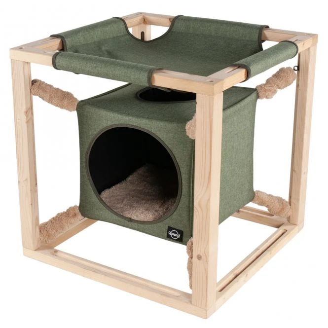 Dieser Katzenwürfel von der Marke Quapas! ist der ultimative Liegeplatz für Ihre Katze. Ihre Katze hat die Wahl zwischen einem wunderbar geschützten Platz im Kubus oder an der Spitze der Hängematte mit Blick über den Raum.