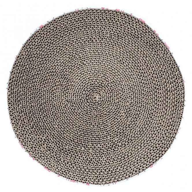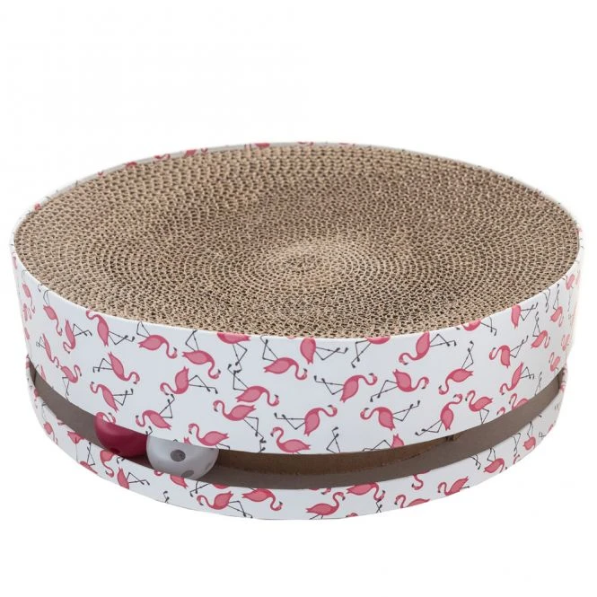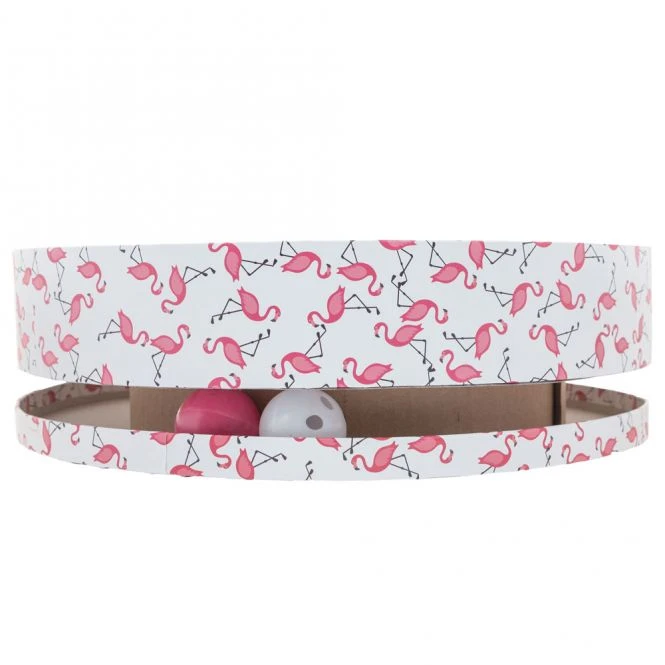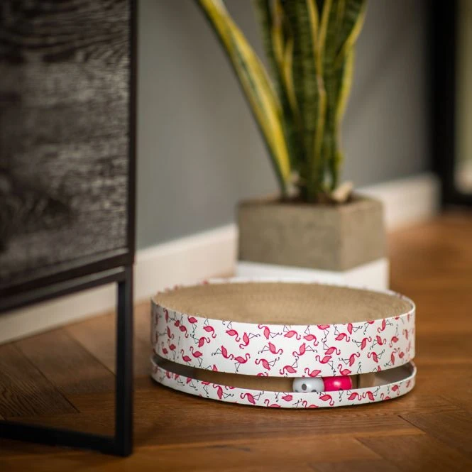Dieses schöne Quapas! Kratzbett aus recycelbarer Wellpappe hat ein tolles Flamingo-Motiv und einen Spielball. Ihre Katze kann damit spielen, daran kratzen oder darauf liegen.