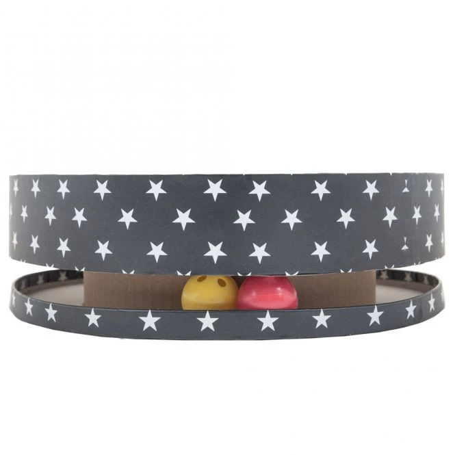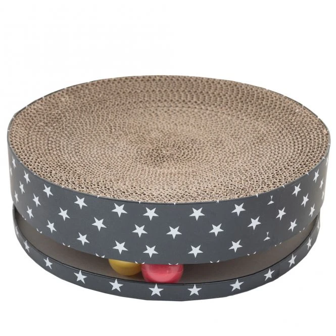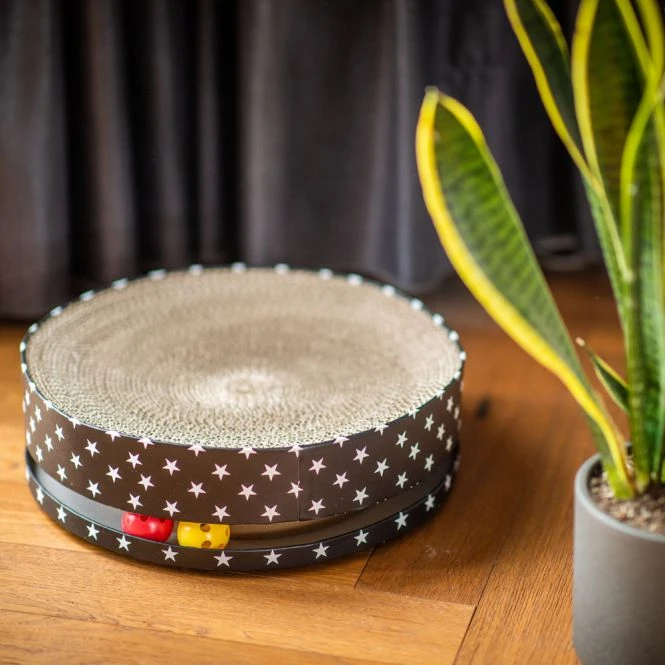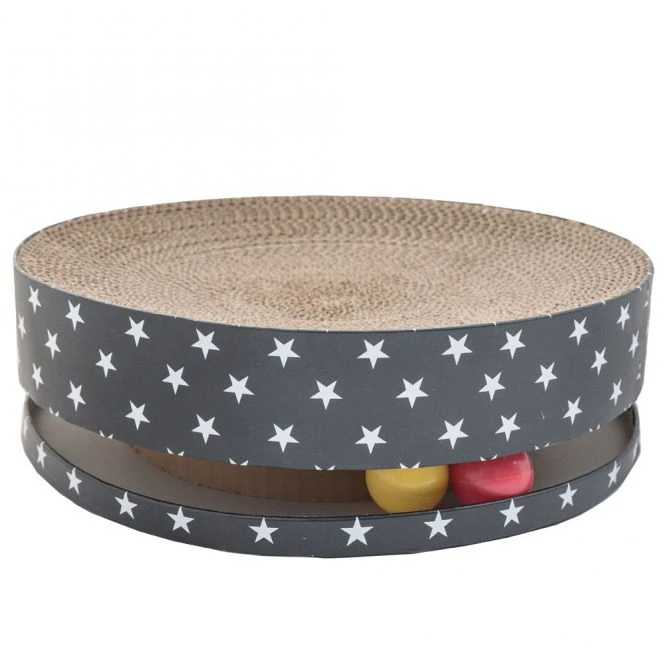 Dieses schöne Quapas! Kratzbett aus recycelbarer Wellpappe hat ein tolles Sternen-Motiv und einen Spielball. Ihre Katze kann damit spielen, daran kratzen oder darauf liegen.