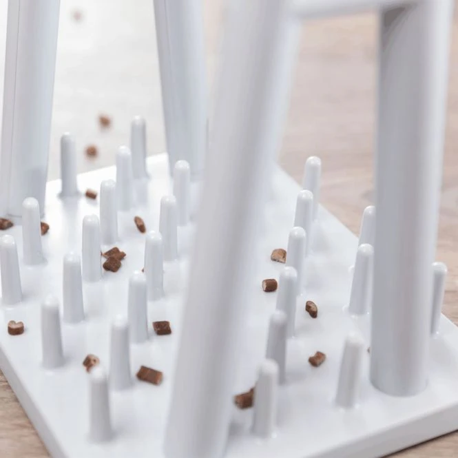 Das Verstecken von Leckerlis in den Bechern wird das Interesse Ihrer Katze wecken. Sie erspäht die Belohnung und versucht sie durch Strategie, Geschicklichkeit und Ausdauer zu erbeuten. Nach einer gewissen Übungszeit gelingt es ihr, die Becher mit ihrer Pfote zu drehen, bis einige Leckerlis auf die Grundplatte mit den Zapfen fallen. Mit ein wenig ‚Pfoten-Geschick‘ kann sie ihre Belohnung dann herauspföteln.