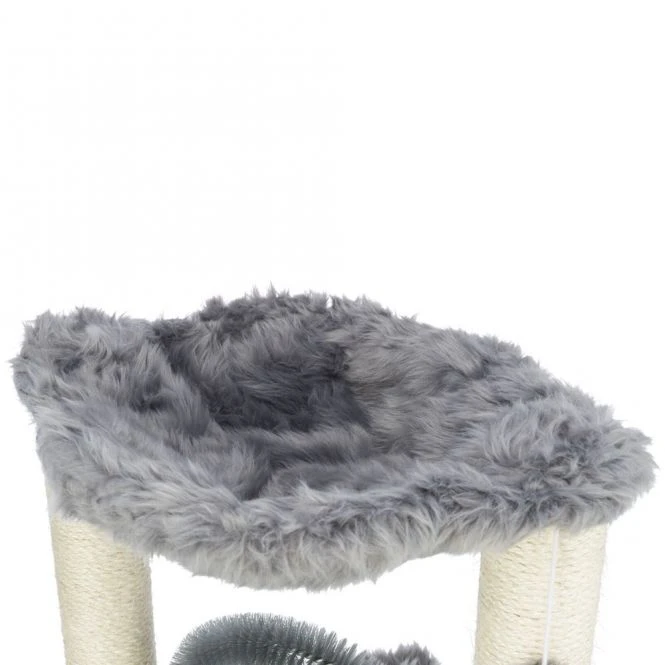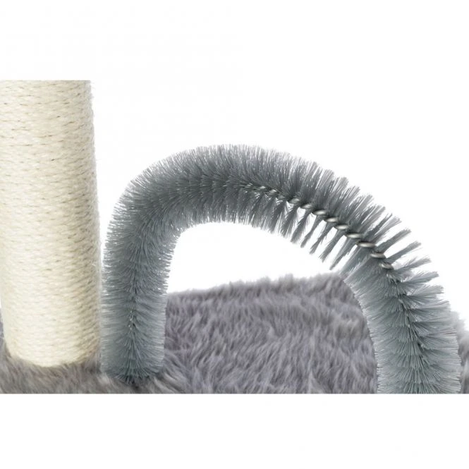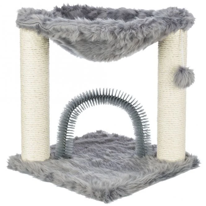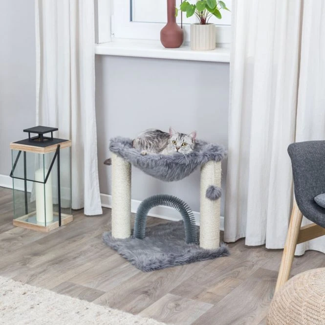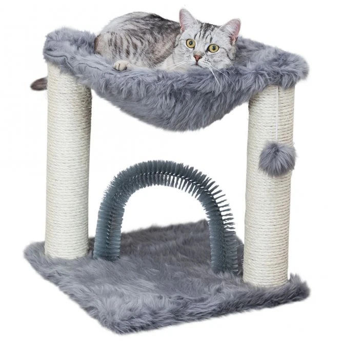 Unser Kratzbaum Baza mit integriertem Fellpflegebogen bietet deiner Samtpfote alles, was sie braucht – Sisalstämme zum Kratzen und Klettern sowie eine gemütliche Liegemulde zum Ausruhen.
