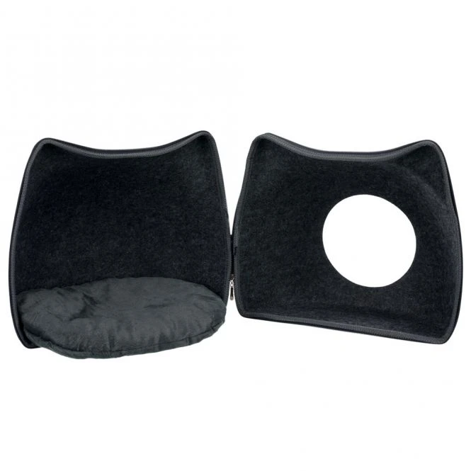 Durch den Reißverschluss lässt sich die Höhle komplett öffnen und platzsparend verstauen. Ein Kissen mit Plüsch-Bezug und Polyestervlies-Füllung macht die Höhle zu einem kuscheligen Schlafplatz. Das Kissen kann per Handwäsche gereinigt werden.