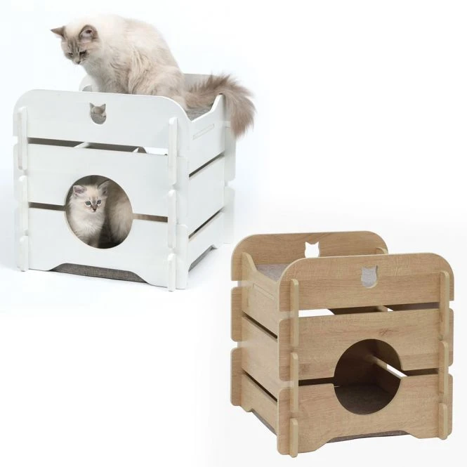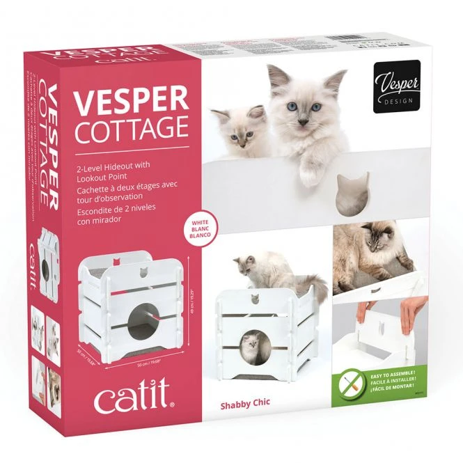 Die Vesper Katzenhöhle Cottage ist ein kubisches Möbelstück für Katzen im romantischen Landhausstil. Es besteht aus einem gemütlichen Versteck unten und einer Aussichtsplattform oben auf dem Möbelstück. Beide Etagen sind mit weichen, gepolsterten Kissen ausgestattet. Darüber hinaus verfügt das Versteck über zwei Eingänge, damit sich Ihre Katze nicht eingeengt fühlt.